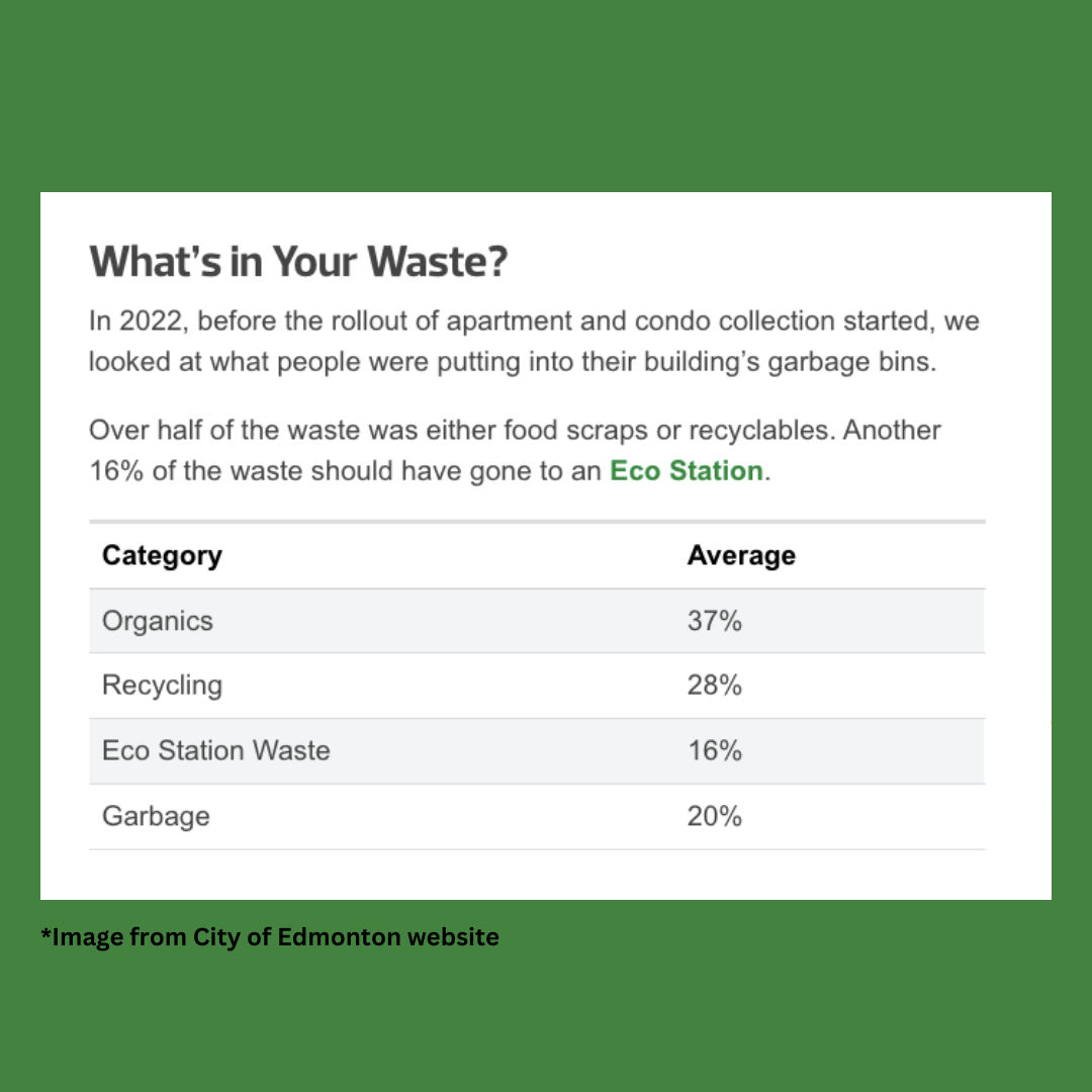 The City of Edmonton has a 25-year waste strategy. The strategy calls for all residential properties in Edmonton to have three-stream sorting by 2027 (garbage, recycling, and organics). This is an important step in waste reduction to avoid harmful greenhouse gasses like methane. Currently, 18% of emissions in Canada are from waste. This process also creates products like compost that can be reused.
