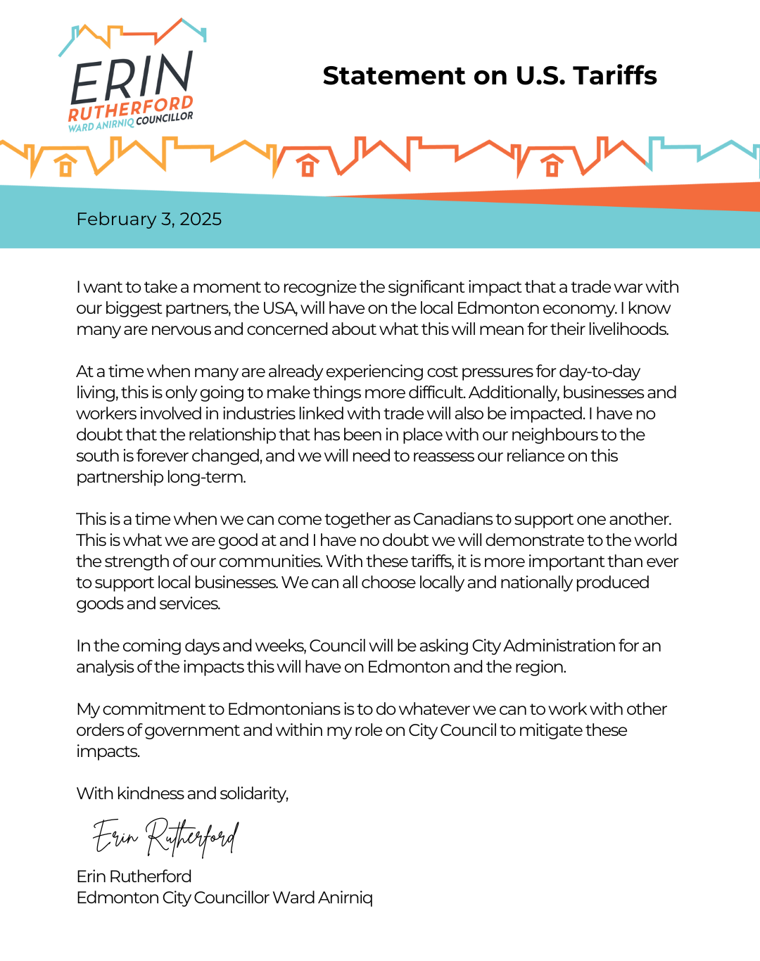 I want to take a moment to recognize the significant impact that a trade war with our biggest partners, the USA, will have on the local Edmonton economy. I know many are nervous and concerned about what this will mean for their livelihoods.