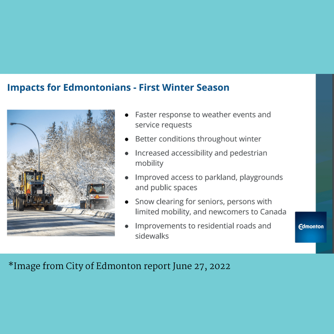 Summer is in full bloom and the image of a snow-covered city may not be at the forefront of everyone’s thoughts. However, Council recently continued the discussion on several options for how to improve Edmonton’s snow/ice clearing service as a core service. Here’s an update on the decision points at this time.